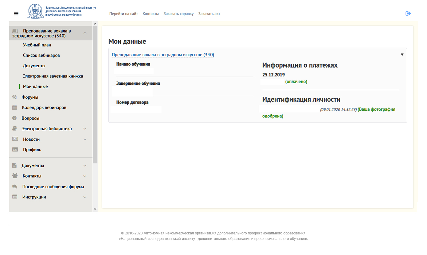 Во вкладке «Мои данные» личного кабинета вы можете увидеть основную информацию по вашей программе. Здесь отображены даты начала и окончания обучения, периоды оплаты, а также поля, необходимые для заполнения.