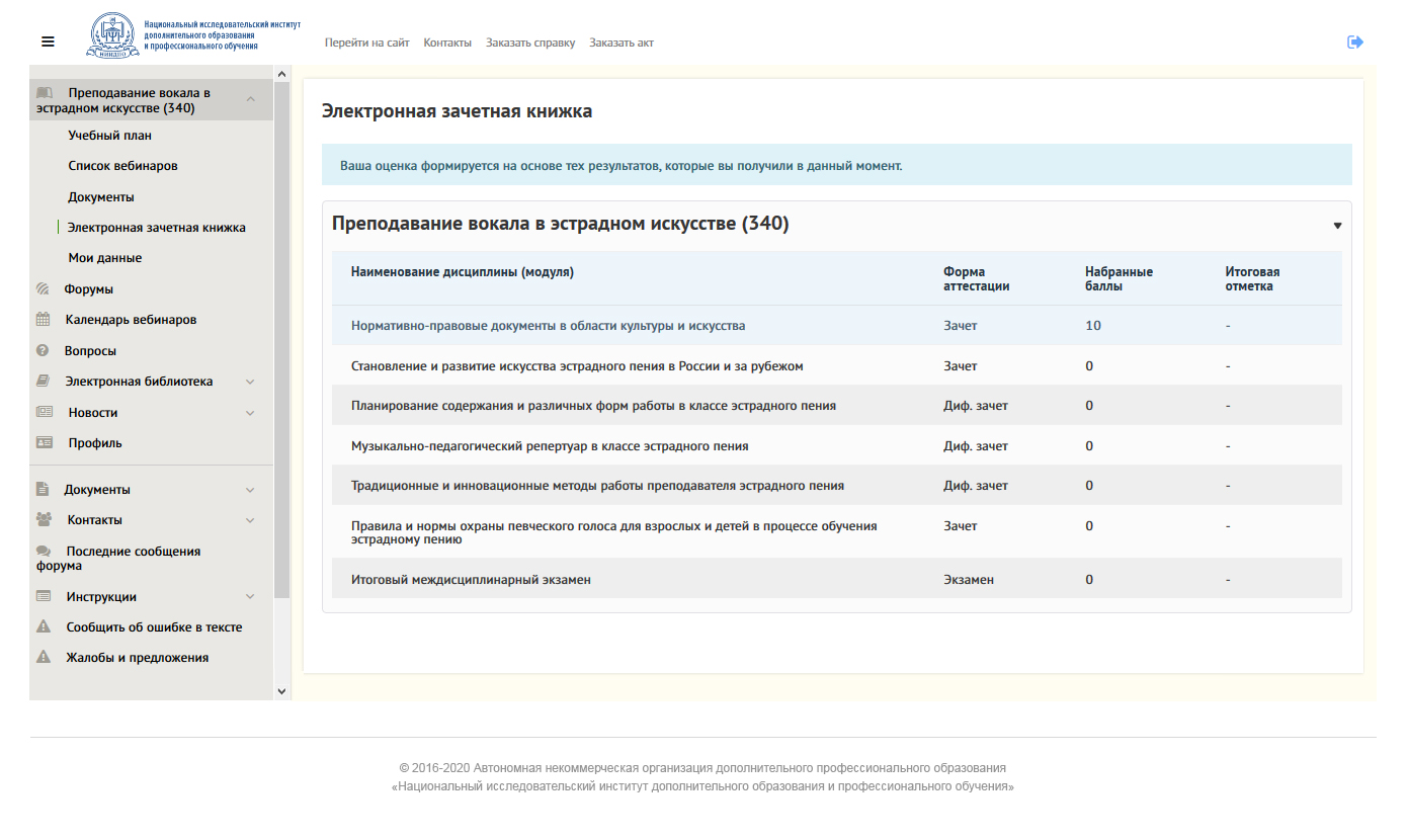 В разделе «Электронная зачетка» личного кабинета вы можете увидеть результаты промежуточной и итоговой аттестации по программе, набранные вами баллы по дисциплинам, итоговую оценку.