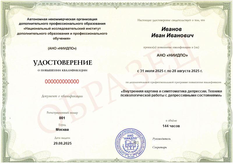 Внутренняя картина и симптоматика депрессии. Техники психологической работы с депрессивными состояниями (144ч)