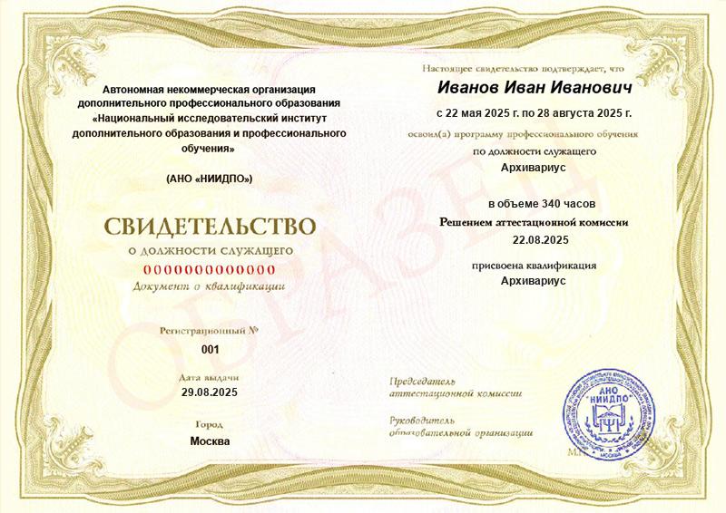 - Свидетельство о профессиональном обучении с присвоением квалификации архивариуса