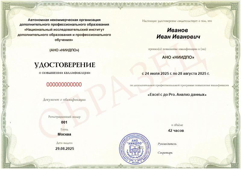 Учебный план программы повышения квалификации «Exсel с 0 до Pro. Анализ данных»