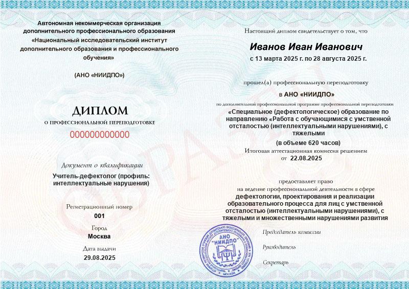 Специальное (дефектологическое) образование по направлению «Работа с обучающимися с умственной отсталостью (интеллектуальными нарушениями), с тяжелыми и множественными нарушениями развития». Олигофренопедагогика и олигофренопсихология (620ч)