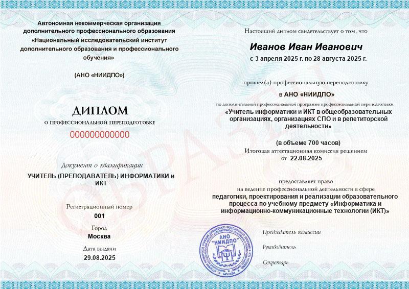 Студент, желающий поступить в АНО «НИИДПО», должен предоставить справку из образовательной организации. Независимо от срока окончания обучения по программе дополнительного образования, диплом о профпереподготовке выдаётся только после предъявления документа о получении среднего профессионального или высшего образования.